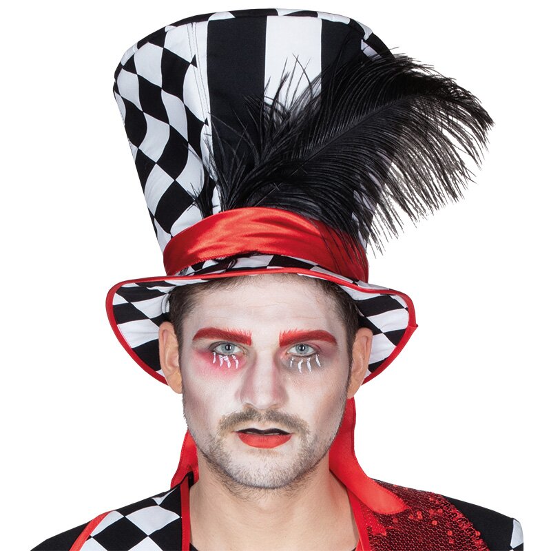 POPIS ZBOŽÍ černobílý klobouk pierot Vysoký cylindr vyrobený z kostkované a pruhované látky v černé a bílé barvě. Široký lem a okraj kšiltovky jsou červené. Klobouk je zdoben černým peřím.