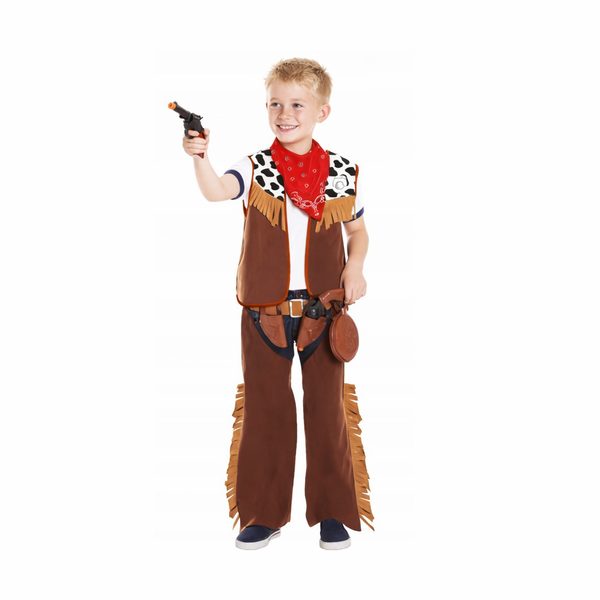 POPIS ZBOŽÍ chlapecký kostým kovboj Kovbojský kostým. Sada obsahuje: Vestu s potiskem krávy a ozdobnými třásněmi. Opasek s přehozy přes kalhoty. Červený šátek. Pistoli s pouzdrem. Jídelní dózu. Odznak šerifa. Materiál: 100% polyester.