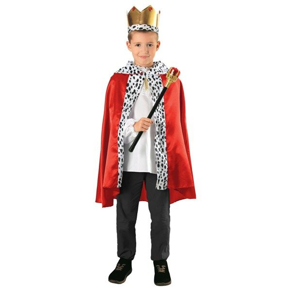 POPIS ZBOŽÍ chlapecký kostým král Sada obsahuje: - plášť - korunu - žezlo. Plášť je vyroben z červeného polyesteru s černými a bílými detaily. Koruna se zapíná na suchý zip. Žezlo je přibližně 42 cm dlouhé.