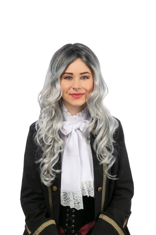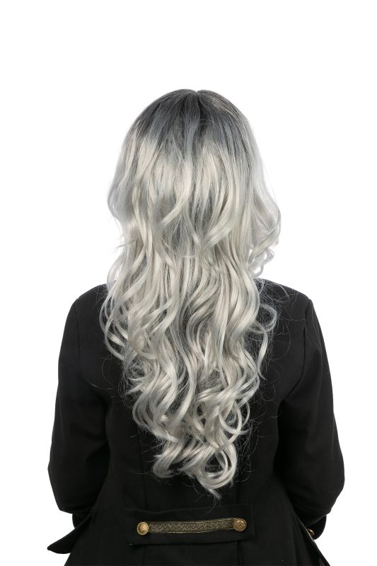 šedá paruka s dlouhými vlasy a tmavými kořínky