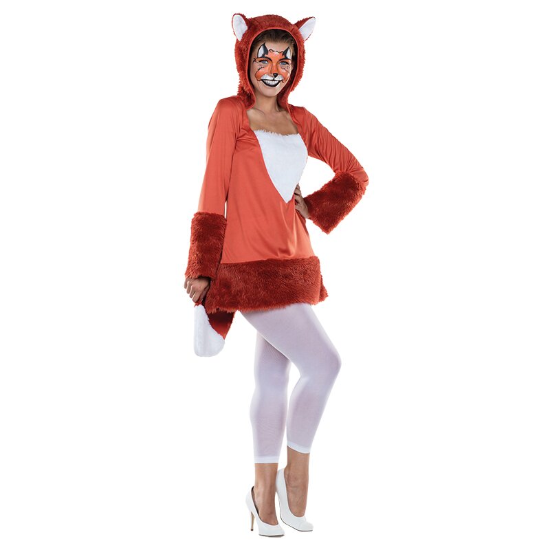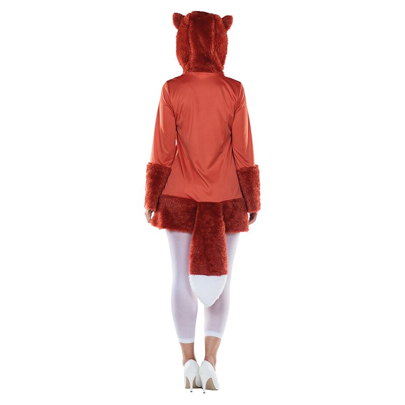 POPIS ZBOŽÍ dámský kostým liška Hnědá tunika s kapucí a připevněným liščím ocasem. Tunika je lemována nědým plyšem na hlavě, lemu a manžetách a bílým plyšem na výstřihu, ušícha špičce ocasu. Součástí jsou hnědé plyšové návleky na nohy.