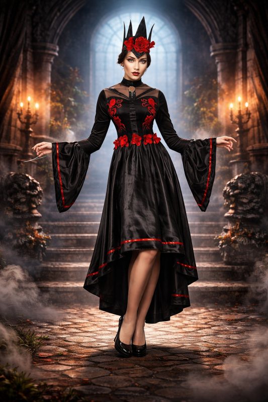 POPIS ZBOŽÍ dámský kostým temná královna Sada obsahuje: - šaty, - korunku. Černé šaty s dlouhým rukávem zdobené červenými květy. Korunka z černé látky se zapínáním na suchý zip. Materiál: 100% polyester.