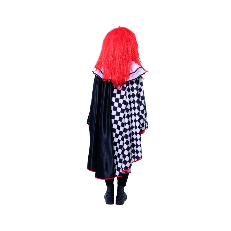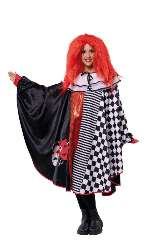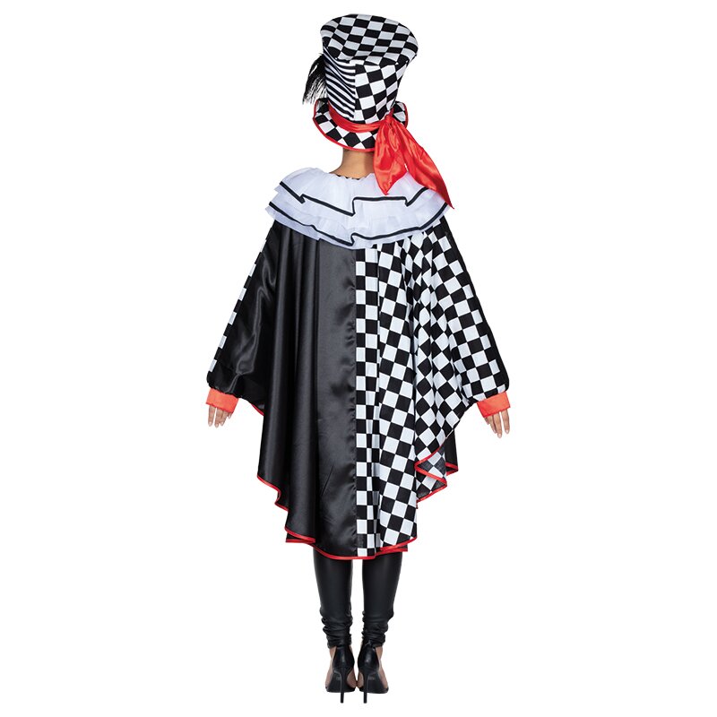 Široký plášť z černé, černobíle pruhované a kosočtvercové látky s dvouřadým