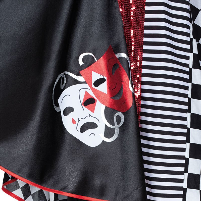 flitrovanou červenou látkou a potiskem masek Pierrotů. Manžety na obou