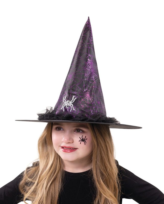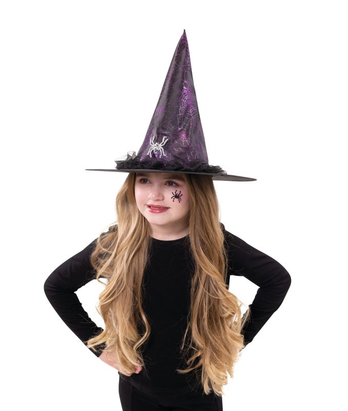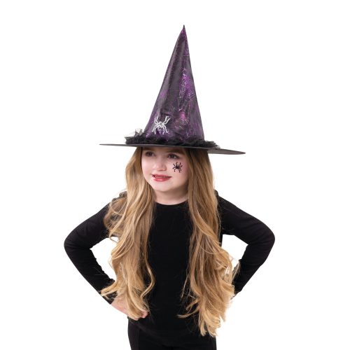 POPIS ZBOŽÍ dětský čarodějnický klobouk Vysoký černý čarodějnický klobouk s fialovým potiskem pavučin a pavouků. Klobouk je vpředu zdoben černým tylem a uprostřed má připevněného stříbrného pavouka.