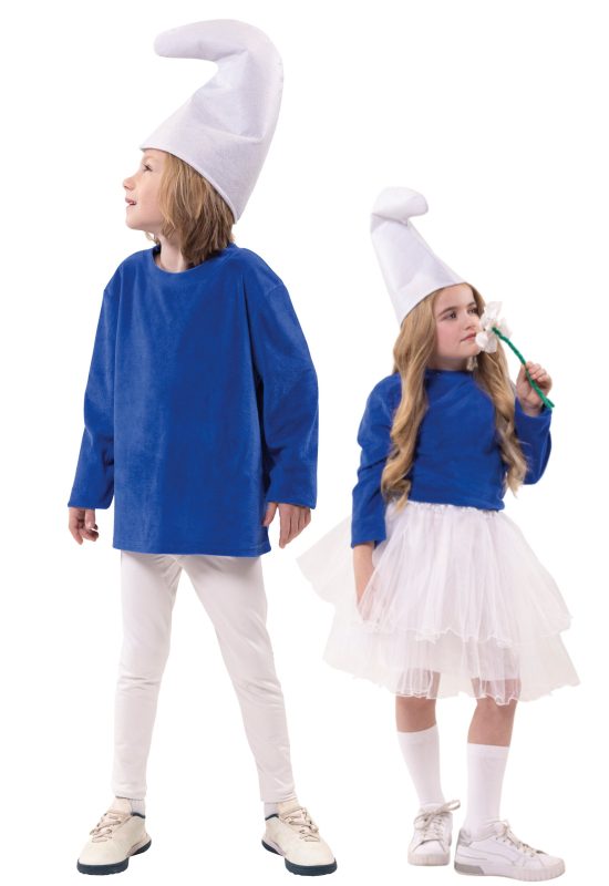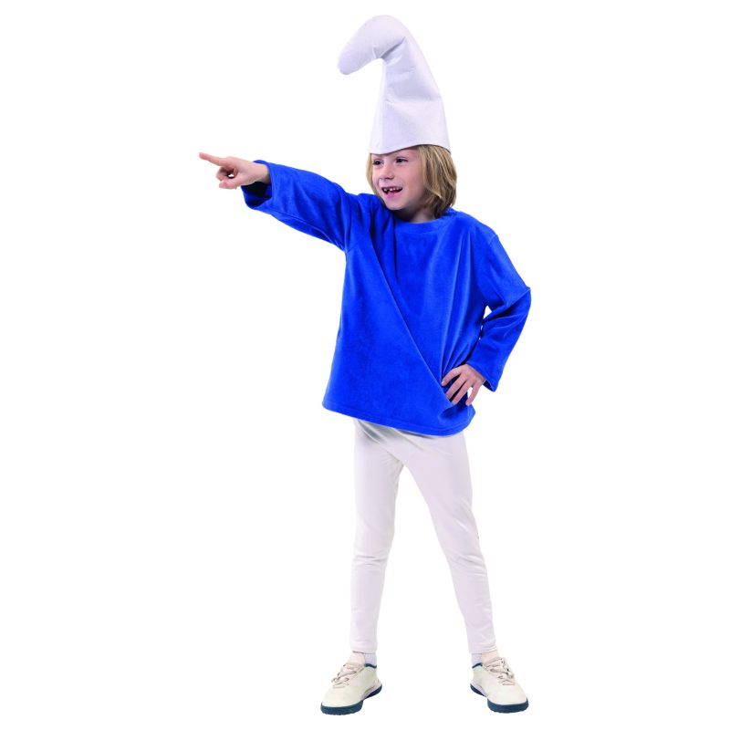 Modrá velurová košile s dlouhým rukávem a bílá čepice – náš skřítek Smörfi