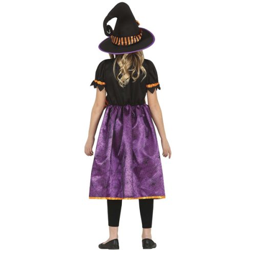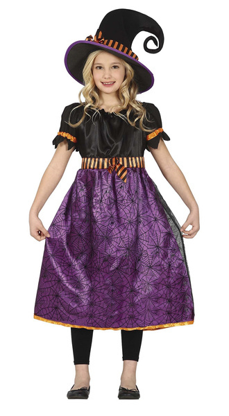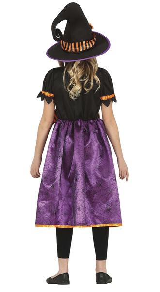 POPIS ZBOŽÍ dívčí kostým čarodějnice Šaty s krátkým rukávem ve fialové, černé a oranžové barvě. Sukně je fialová, zdobená tenkou černou látkou s potiskem pavučiny. Outfit je doplněn černým čarodějnickým kloboukem.