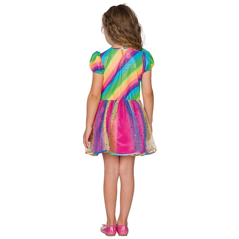 POPIS ZBOŽÍ dívčí kostým duhová víla Šaty s krátkým rukávem v zářivých duhových barvách, zdobené srdíčkem na hrudi a květinami kolem pasu. Šaty mají svrchní sukni z třpytivého tylu.