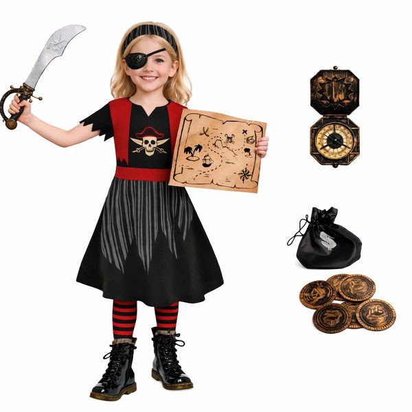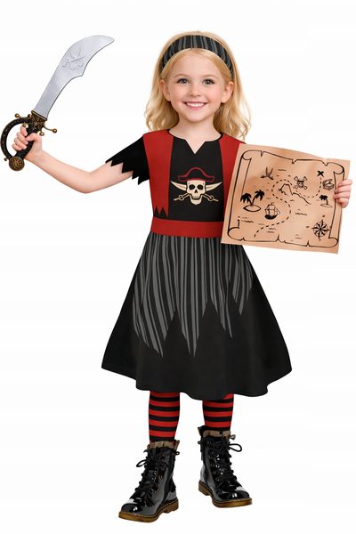 POPIS ZBOŽÍ dívčí kostým pirátka 104 Sada obsahuje: - šaty, - punčocháče, - čelenku, - mapu, - pásku přes oko, - meč, - kompas, - pouzdro na mince.