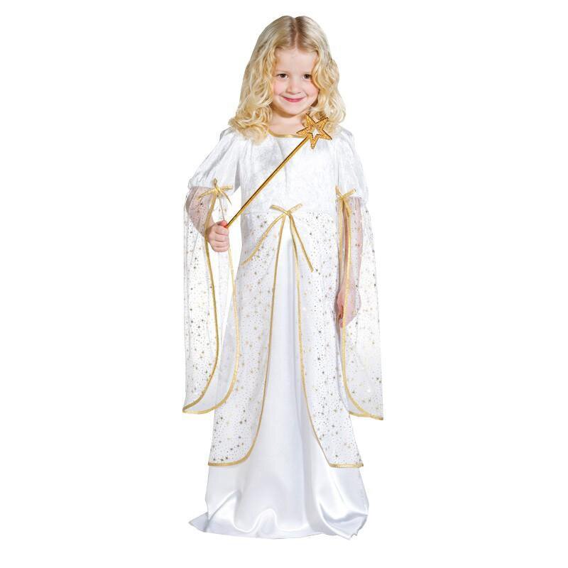 POPIS ZBOŽÍ dívčí kostým šaty anděl Bílý andělský kostým s vrchním dílem z mačkaného sametua dlouhou sukní s efektem saténu. Vrchní sukně a rukávy střpytivým hvězdicovým tylem. Šaty jsou zdobeny zlatými mašlemi.