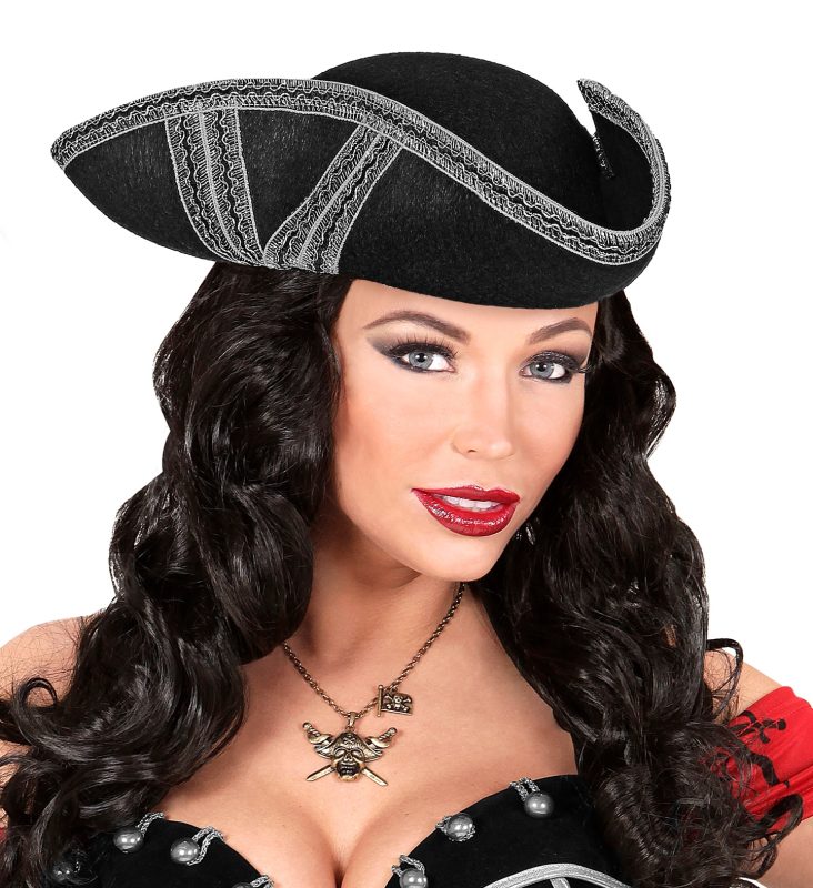 POPIS ZBOŽÍ historický třírohý klobouk Stylový trojrohý klobouk v černém provedení s výrazným stříbrným lemováním. Ideální doplněk pro kostým piráta, mušketýra nebo historické postavy.