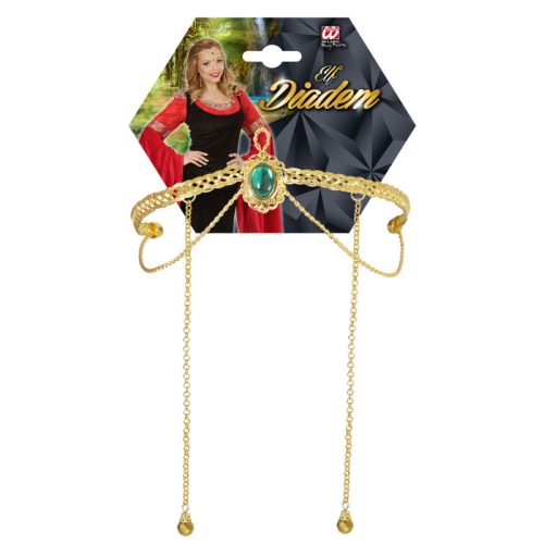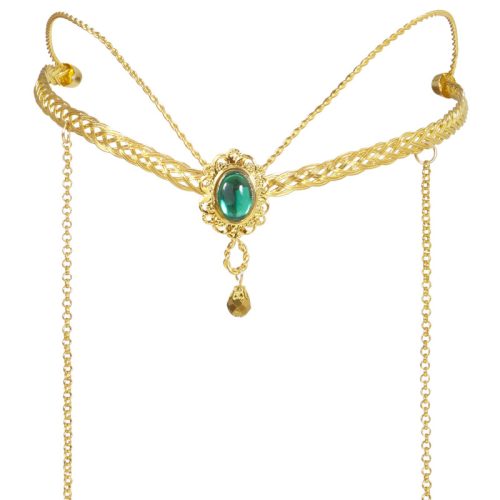 Elfí čelenka, fantazie, zlatá se zeleným kamínkem, kovová.