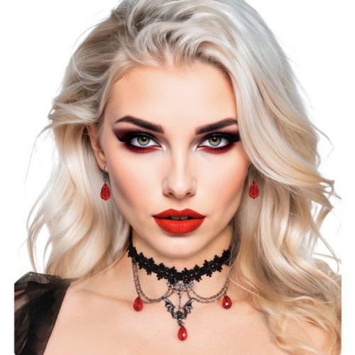 POPIS ZBOŽÍ gotický set náhrdelník a náušnice Halloweenský náhrdelník a náušnice. Gotický, s upírskou tematikou. Barvy: černá, stříbrná, červená. Nastavitelná spona. Dokonalá halloweenská sada