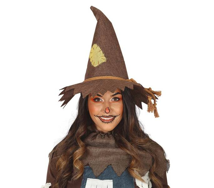 POPIS ZBOŽÍ klobouk strašák Strašák. Barva: odstíny hnědé. Obvod přibližně 58 cm. Průměr přibližně 41 cm.Kšilt je trojúhelníkový. Klobouk je zdoben šňůrkou a dvěma červenými a žlutými nášivkami. Vyrobeno z materiálu připomínajícího jutový pytel.