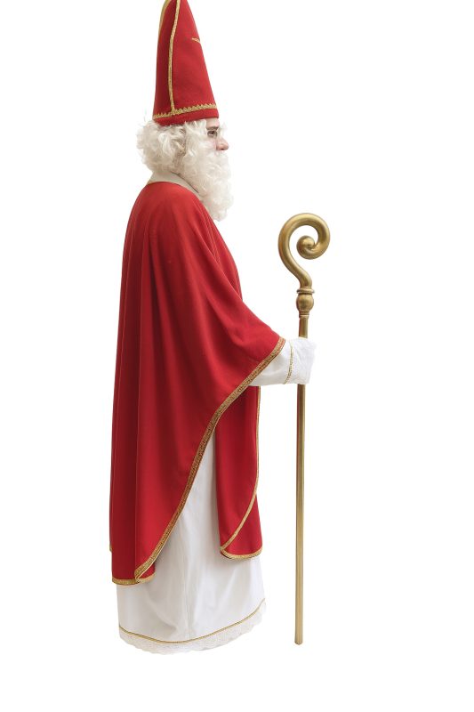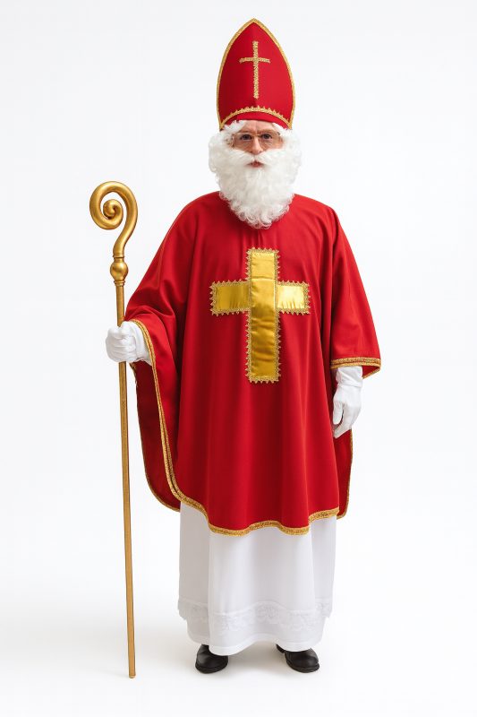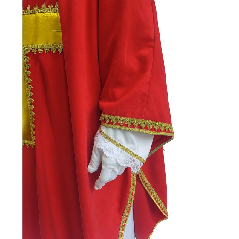 POPIS ZBOŽÍ kostým Mikuláš košile, pelerína, otevřená čepice Mikulášský kostým skládající se z velké peleríny se zlatým lemováním, zlatým prýmkem a výrazným zlatým křížem. Dlouhé košili s krajkou a zlatým prýmkem. Materiál: 90% Polyester, 10% Metalické vlákno