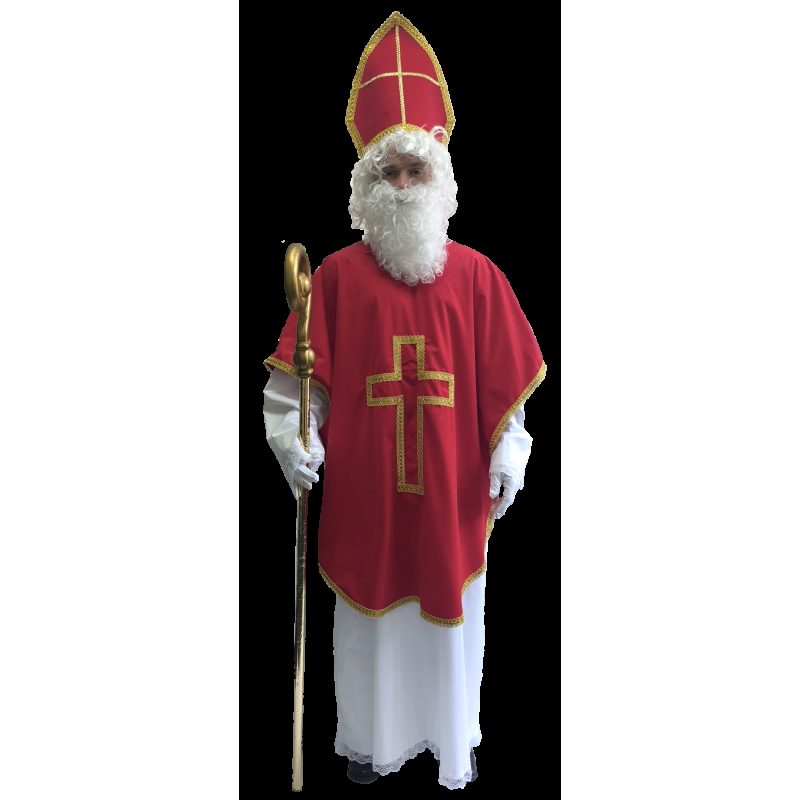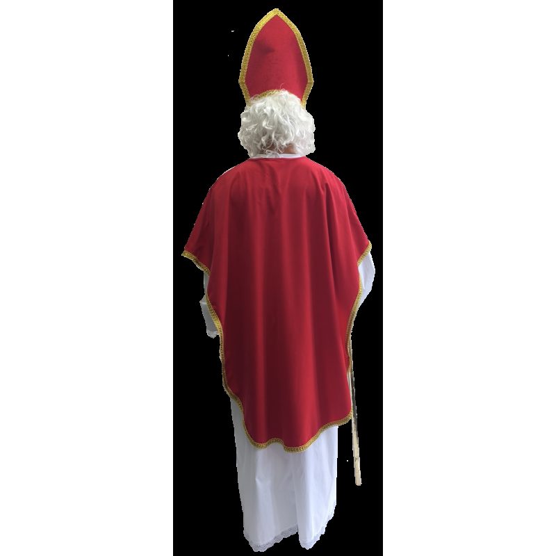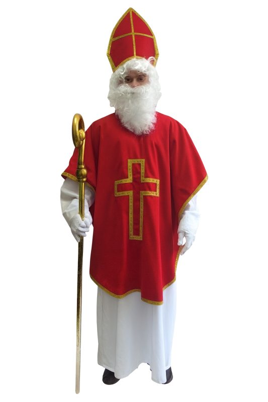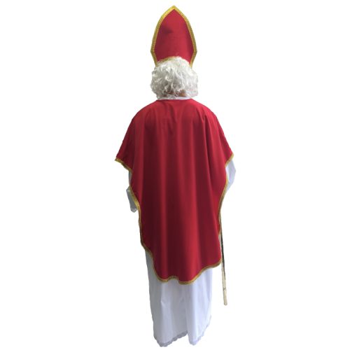 POPIS ZBOŽÍ kostým Mikuláš košile, pelerína, čepice Kostým Mikuláše zkladající se z peleríny a čepice se zlatým lemováním a kříži ze zlatého prýmku vše doplněno dlouhou bílou košilí s krajkou. Materiál: 90% Polyester, 10% Metalické vlákno