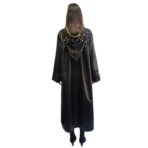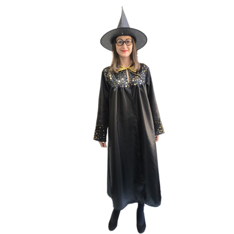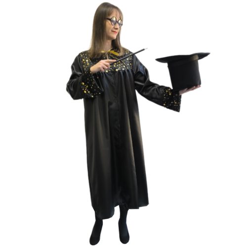 POPIS ZBOŽÍ kouzelnický plášť s kapucí Kouzelnický plášť je zhotoven z černého saténu a lesklého materiálu se zlatými hvězdičkami. Plášť má také kápi a je olemován zlatou lemovko