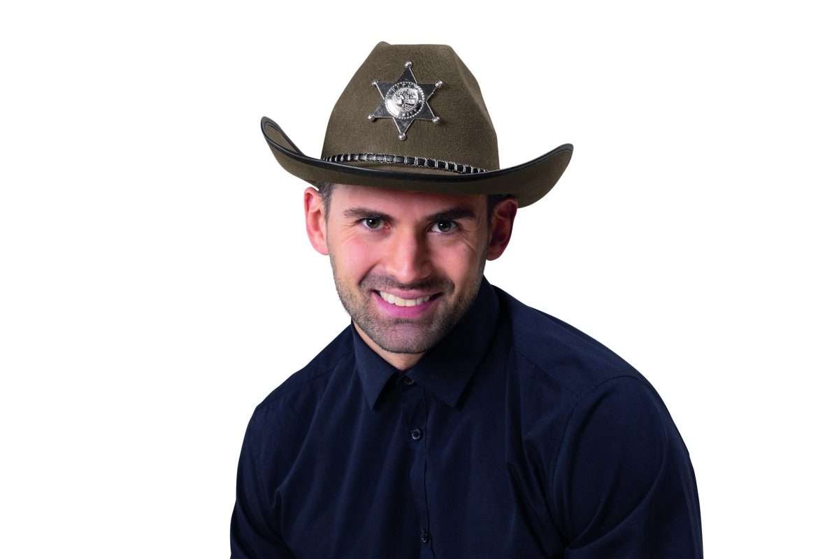 POPIS ZBOŽÍ kovbojský klobouk s šerifovou hvězdou hnědý Hnědý kovbojský klobouk se stříbrnou šerifskou hvězdou uprostřed přední části, černo-stříbrným lemem a černou šňůrkou. Kšilt je zakončen černým lemem.
