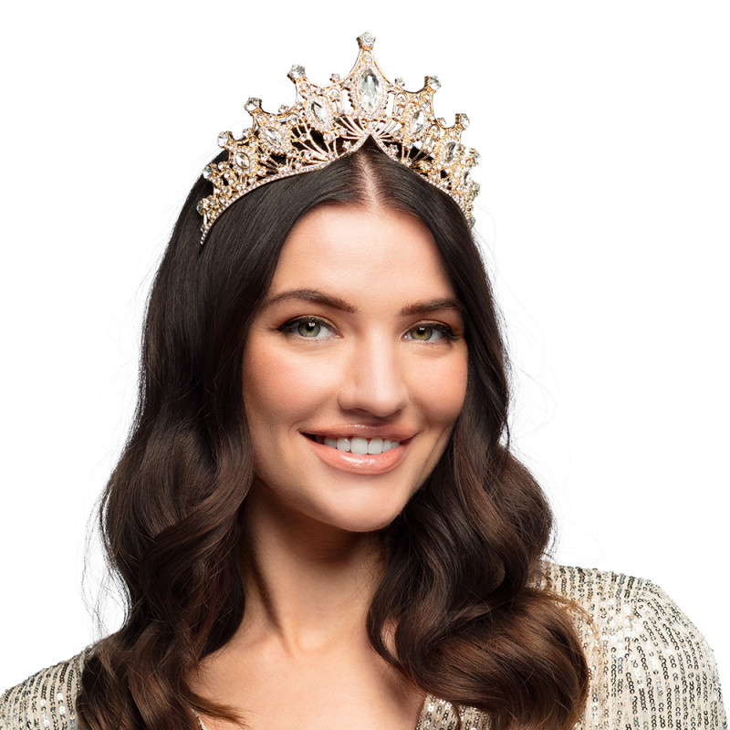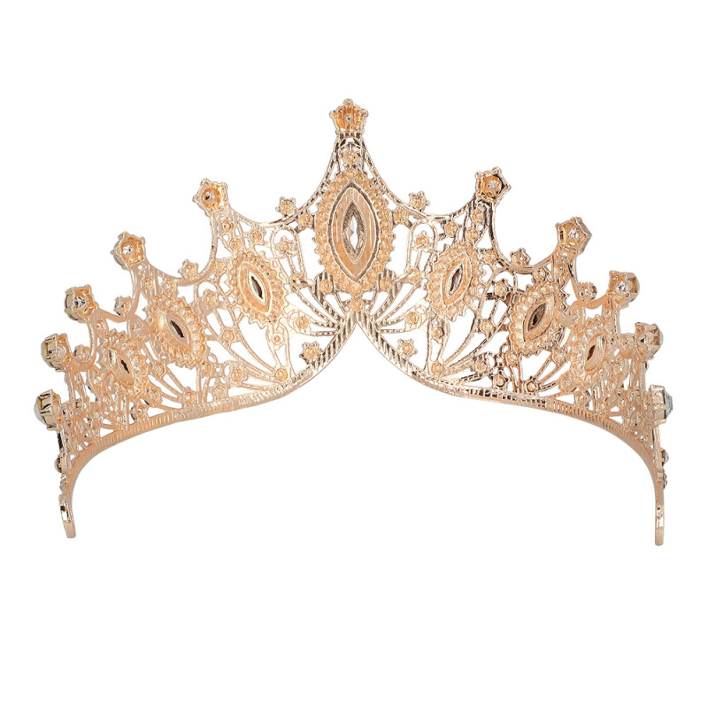 Královská kovová čelenka vzhledu z růžového zlata. Luxusní doplněk ke královskému outfitu jako královna, nebo pohádková princezna během karnevalu, nebo pro dodání královského nádechu svatebnímu outfitu. Čelenka má zdobený design se stříbrnými diamanty.