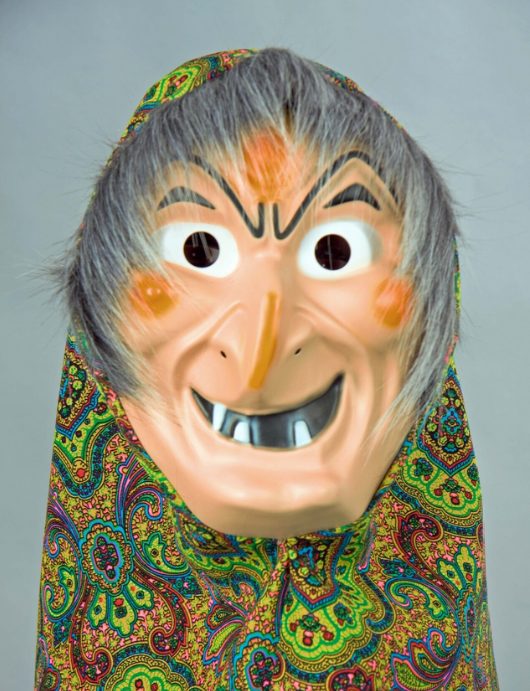 Materiál masky je tenký plast, šátek je z 100%PES.