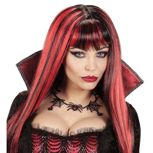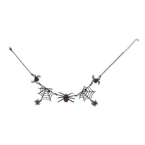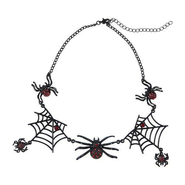 Černý náhrdelník zdobený pavouky s červenými flitry a pavučinou.