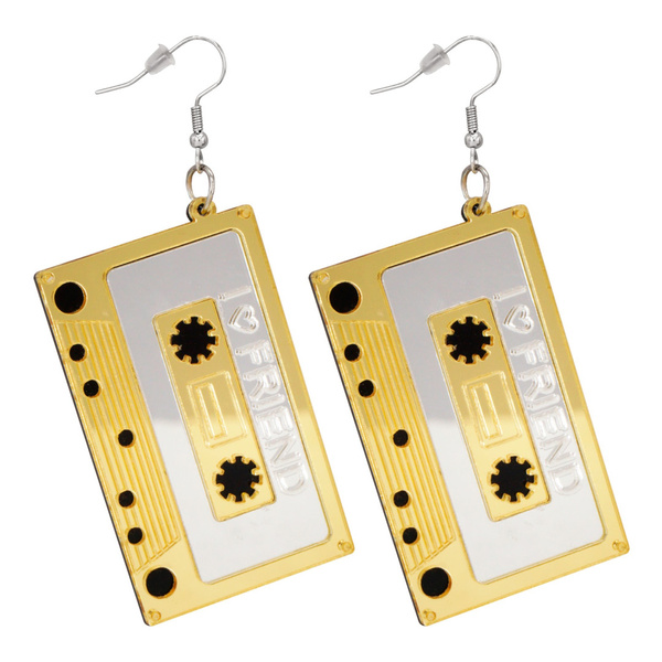 POPIS ZBOŽÍ náušnice kazety 80.léta Barva: zlatá a stříbrná s černými detaily. Zapínání: háčky s gumovými zarážkami. Rozměry: délka cca 5 cm, šířka cca 3 cm