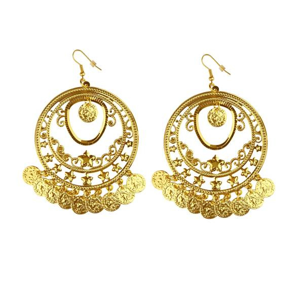 POPIS ZBOŽÍ náušnice zlaté cikánka Tyto náušnice jsou vyrobeny ze zlatého plastu. Jsou zdobeny ozdobami ve tvaru hvězdy a mince.