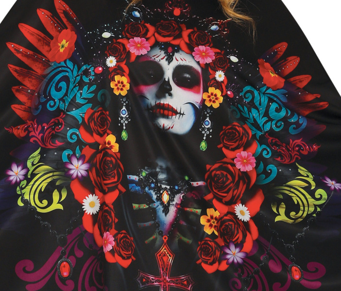 POPIS ZBOŽÍ pončo Los Muertos Vel. L Vel. LČerné pončo s kapucí ve stylu Los Muertos. S potiskem ženské lebky a barevných květin. Barva: černá. Materiál: 100% polyester.