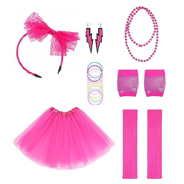 POPIS ZBOŽÍ sada disco doplňků 80.léta Sada obsahuje: - krajkovou čelenku s mašlí, - korálkový náhrdelník, - náušnice, - síťované rukavice, - 10 náramků, - baletní sukni, - návleky na nohy.
