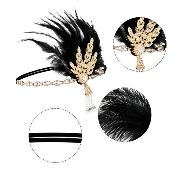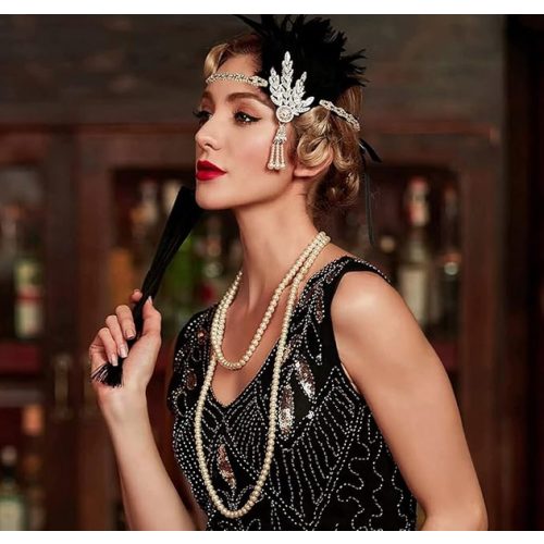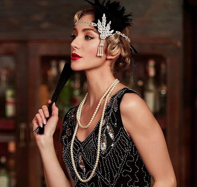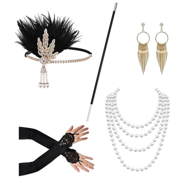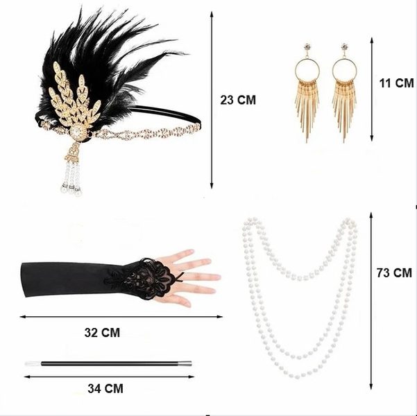 POPIS ZBOŽÍ set doplňků 20.léta Sada obsahuje: čelenku, rukavice, šňůrku na cigarety, náhrdelník perel, náušnice.