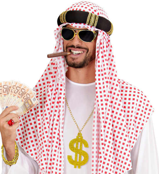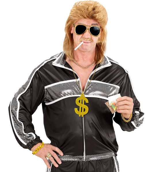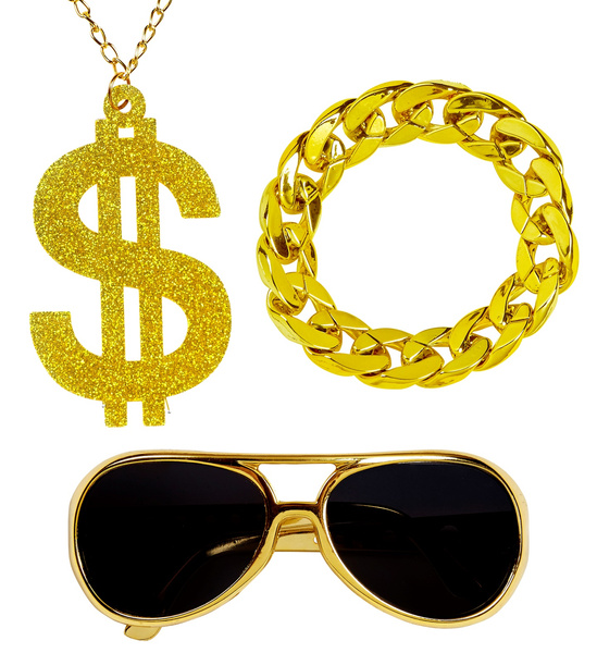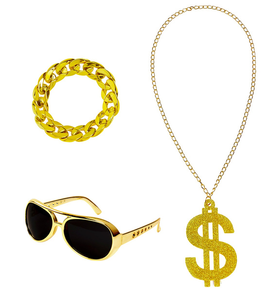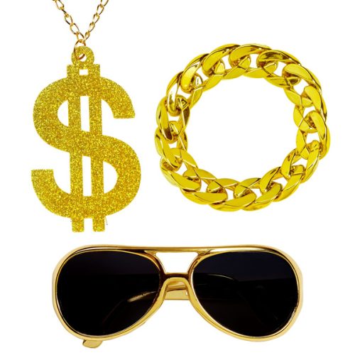 POPIS ZBOŽÍ set doplňků rapper Rapperův set obsahuje: náhrdelník, náramek, brýle. Náhrdelník s velkým zlatým znakem dolaru pokrytým třpytkami. Náramek ve tvaru silného řetízku. Zlaté brýle s černými skly.