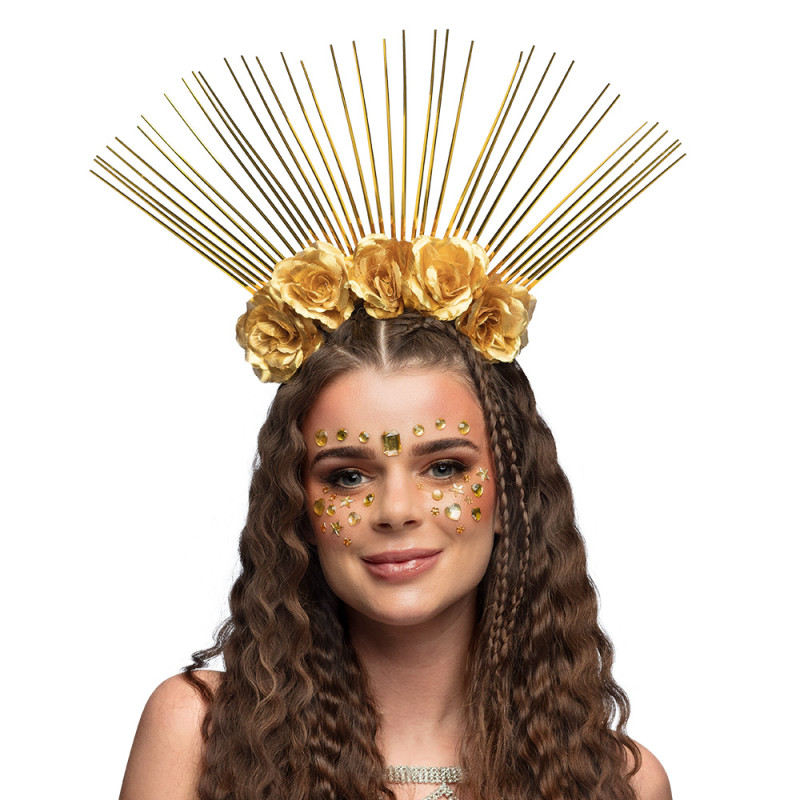 Tato krásná dekorace Nova je unikátní čelenka s velkými zlatými květy, které rozzáří festivalový nebo svatební outfit a dodají vzhledu božský nádech. Kromě toho je tato čelenka také jedinečným doplňkem k dokončení kostýmu bohyně nebo anděla na karneval nebo párty.